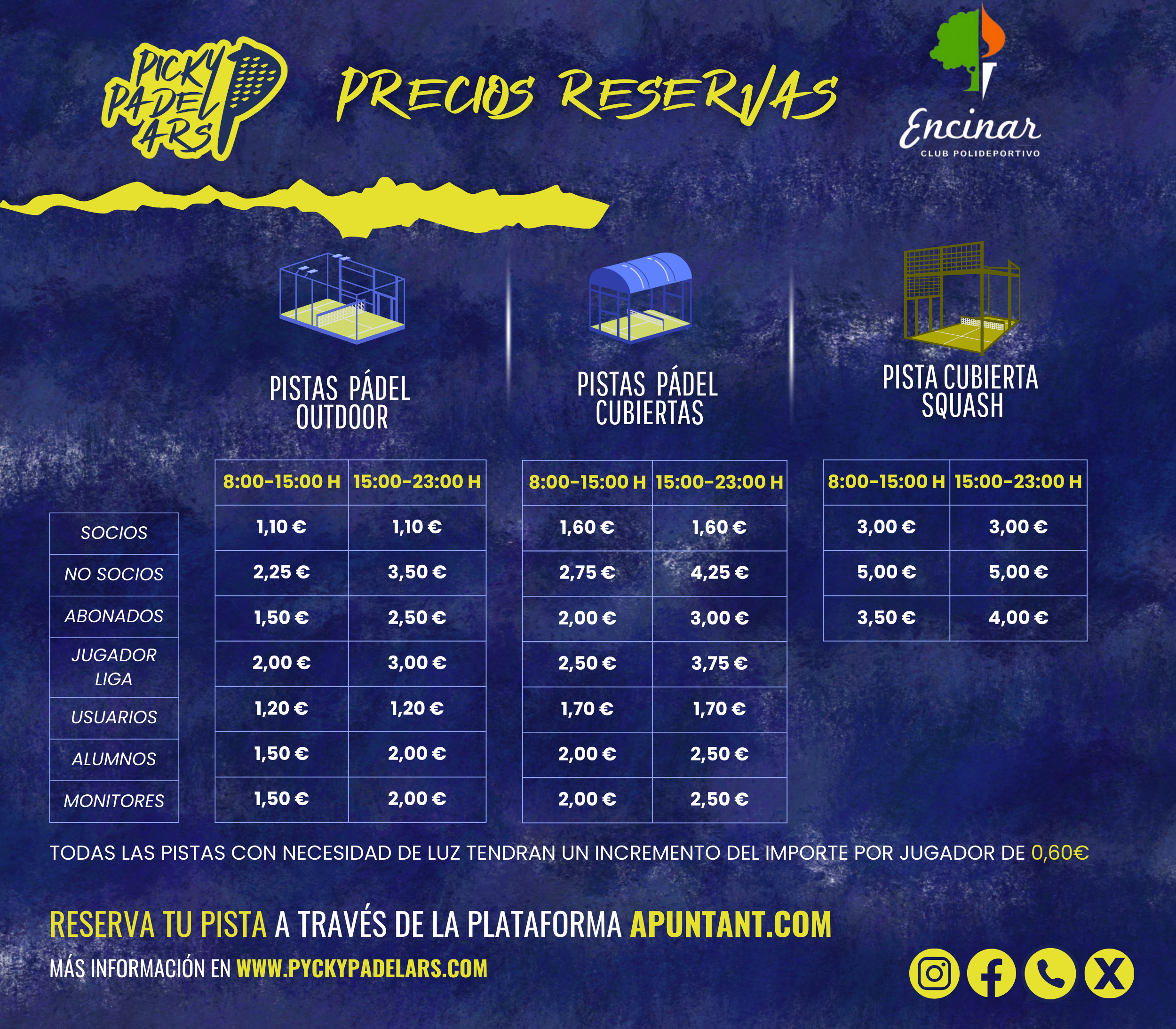 LAS RESERVAS CON LUZ SE TENDRÁN QUE PAGAR SU IMPORTE EN FUNCIÓN DE LA ESTACIÓN Y LOS CAMBIOS DE HORA. EN LA FRANJA QUE COINCIDA CON EL CREPÚSCULO, SE APLICARÁ LA TARIFA CON LUZ OBLIGATORIAMENTE, INDEPENDIENTEMENTE DE LOS HORARIOS PUBLICADOS COMO REFERENCIA. A PARTIR DEL 2025 EL PRECIO DE LA RESERVA CON LUZ PASARÁ DE 0,50 A 0,60€ POR JUGADOR.